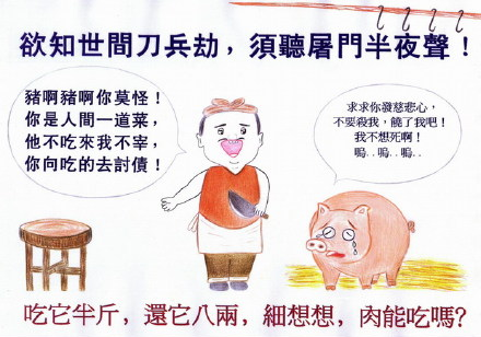 当猪命死以后,又有二人将他捉去,又将他投置黑暗的所在,觉得奇寒无比,又有一堆衣服掷来,大家又争着取来穿上。但在穿上之后,一念警觉:「我不能穿衣服,穿上之后,又要去投生为猪了。」随即用力脱下,但已脱不下来,只好将衣服一片片撕毁扯下,但他仍然投入猪胎,出生为小猪。